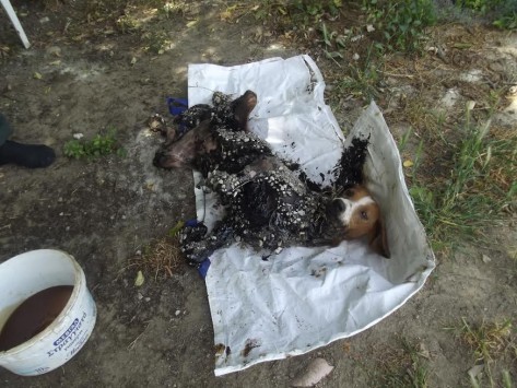 Η σκυλίτσα απεγκλωβίστηκε από την πίσσα από δύο εθελοντές φιλόζωους στο Σιδηρόκαστρο Σερρών. ''Ο ιδιοκτήτης της γνώριζε από την πρώτη στιγμή το ατύχημα και δεν έκανε το παραμικρό'' αναφέρουν μεταξύ άλλων οι εθελοντές που την φροντίζουν και ζητούν βοήθεια για την θεραπεία της και μία υπεύθυνη οικογένεια να την υιοθετήσει.