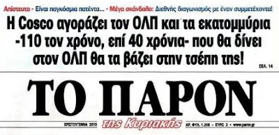 Η Cosco αγοράζει τον ΟΛΠ και τα εκατομμύρια -110 τον χρόνο, επί 40 χρόνια- που θα δίνει στον ΟΛΠ θα τα βάζει στην τσέπη της!