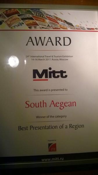 Αυτή τη φορά, η Περιφέρεια Νοτίου Αιγαίου απέσπασε το Βραβείο «BestPresentation of a Region», για το περίπτερό της στην 24η Διεθνή Τουριστική Έκθεση της Μόσχας “ΜΙΤΤ 2017” . Με την πρωτότυπη, ανανεωμένη και στοχευμένη παρουσία του, με ένα περίπτερο που αντιπροσωπεύει τα τυπικά γνωρίσματα των νησιών, το Νότιο Αιγαίο κέρδισε για μια ακόμη φορά τις εντυπώσεις και κατάφερε να ξεχωρίσει στον διεθνή ανταγωνισμό, αποσπώντας τα καλύτερα σχόλια.