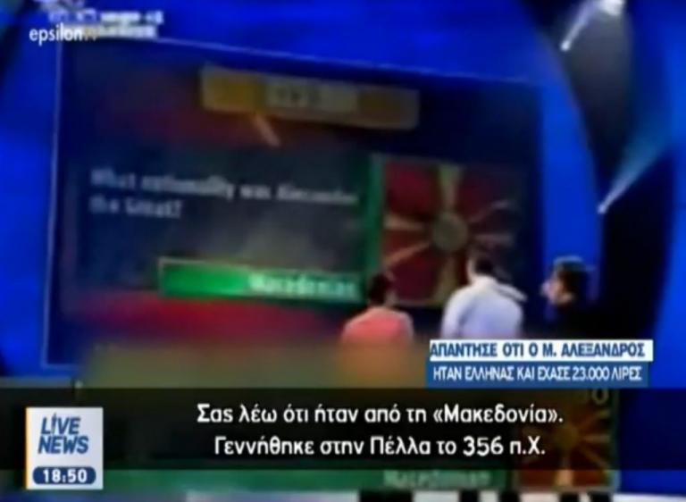 Χρονολογείται από το 2012. Ωστόσο με το Σκοπιανό να βρίσκεται στον «αφρό» της επικαιρότητας, έρχεται ξανά στο προσκήνιο. Είναι ένα βίντεο από τηλεοπτικό παιχνίδι στην Βρετανία. Ένα ζευγάρι διεκδικεί το ποσό των 23.000 λιρών και η ερώτηση που «πέφτει», έχει χρώμα… ελληνικό. Στο επίκεντρο βρίσκεται ο Μέγας Αλέξανδρος.