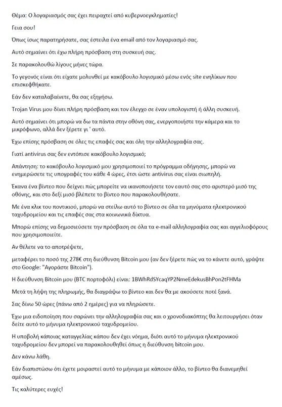 Στη συνέχεια αναφέρεται ότι το κακόβουλο λογισμικό έχει συλλέξει όλες τις επαφές των χρηστών από τα μέσα κοινωνικής δικτύωσης και οι δράστες απειλούν με την αποστολή του επίμαχου υλικού στις επαφές τους, σε περίπτωση που δεν λάβουν bitcoins.