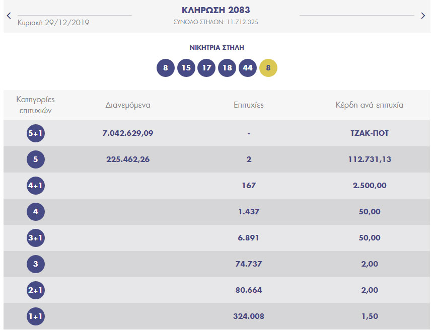 Οι τυχεροί αριθμοί στην κλήρωση Τζόκερ [2083] είναι οι εξής: 15, 17, 18, 8, 44 και Τζόκερ ο αριθμός 8