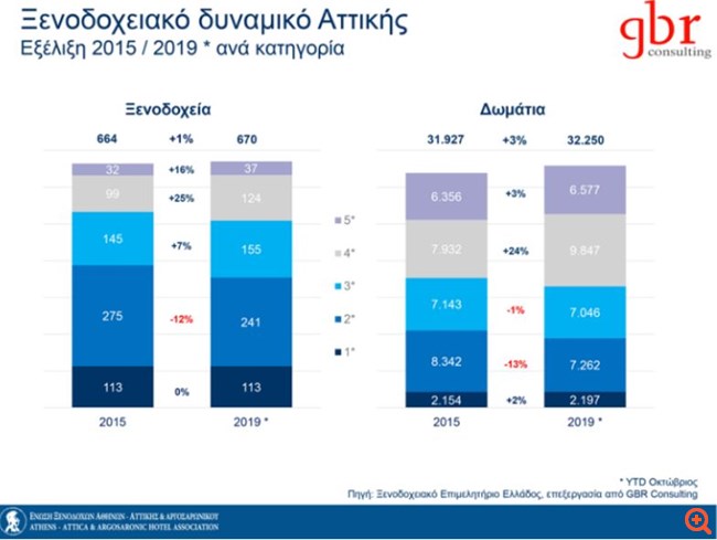 Όπως αναφερόταν μάλιστα στην έρευνα, παρόλο που ο συνολικός αριθμός ξενοδοχείων και δωματίων στην Αττική αυξήθηκε κατά 1% και 3% αντίστοιχα την περίοδο 2015 - 2019, περαιτέρω ανάλυση αποκαλύπτει ότι ο αριθμός των δωματίων 4 και 5 αστέρων στην Αττική αυξήθηκε κατά 24% και 3% , ενώ οι άλλες κατηγορίες μειώθηκαν. Στο κέντρο της Αθήνας οι ρυθμοί ανάπτυξης ήταν 26% και 11% αντίστοιχα.