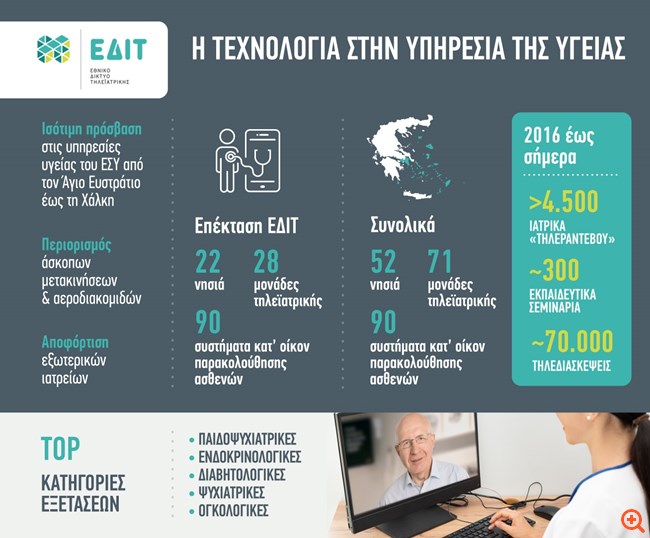 Μετά την επέκτασή του, το ΕΔΙΤ θα διαθέτει συνολικά 71 μονάδες τηλεϊατρικής, οι οποίες θα ενώνουν 52 νησιά του Αιγαίου με κεντρικά νοσοκομεία της χώρας. Μέχρι σήμερα, μέσω του ΕΔΙΤ, έχουν πραγματοποιηθεί περισσότερα από 4.500 "τηλεραντεβού", 290 εκπαιδευτικά σεμινάρια, ενώ έχουν γίνει τουλάχιστον 68.000 τηλεδιασκέψεις, αναβαθμίζοντας τις υπηρεσίες υγείας που προσφέρονται στους κατοίκους των νησιών και μειώνοντας τις μετακινήσεις κι αεροδιακομιδές ασθενών προς τα αστικά κέντρα.