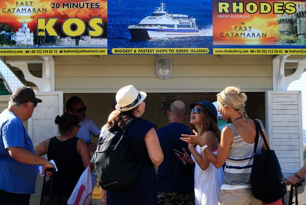 Tουρίστες στην Τουρκία έτοιμοι να αγοράσουν εισιτήρια με προορισμό τα ελληνικά νησιά στο Αιγαίο, αναχωρώντας από την Αλικαρνασό (Μπόντρουμ) το καλοκαίρι του 2015. Φωτογραφία αρχείου.(AP Photo/Lefteris Pitarakis)
