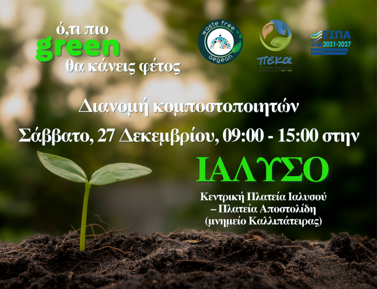 Οι κάτοικοι της Ιαλυσού που έχουν δικαίωμα παραλαβής μπορούν από αύριο να προσέρχονται από τις 09:00 το πρωί έως τις 15:00 στην κεντρική Πλατεία Ιαλυσού – Πλατεία Αποστολίδη (μνημείο Καλλιπάτειρας),προκειμένου να παραλάβουν τους οικιακούς κομποστοποιητές .
