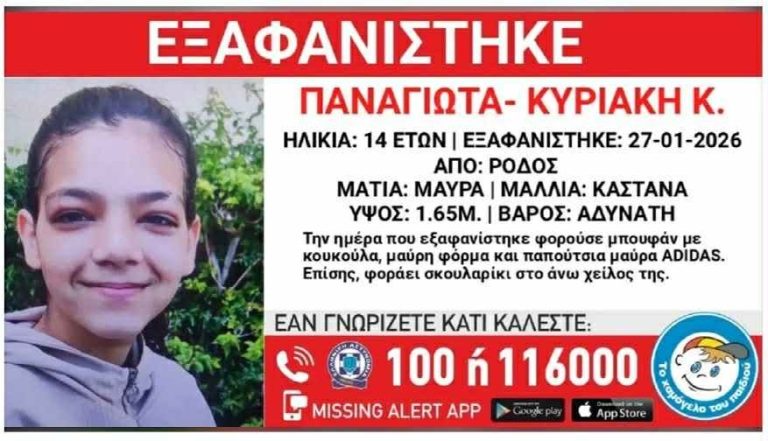 Σε εξέλιξη παραμένουν οι έρευνες των αρμόδιων αρχών για τον εντοπισμό της 14χρονης Παναγιώτας-Κυριακής , η οποία από χθες δεν επέστρεψε στον χώρο παιδικής προστασίας όπου φιλοξενείται στη Ρόδο, με αποτέλεσμα να δηλωθεί η εξαφάνισή της και να κινηθούν οι προβλεπόμενες διαδικασίες. Σύμφωνα με έγκυρες πληροφορίες, η ανήλικη έχει επικοινωνήσει με το προσωπικό του ιδρύματος και έχει δηλώσει ότι είναι καλά στην υγεία της, γεγονός που περιορίζει την ανησυχία. Οι έρευνες συνεχίζονται κανονικά, προκειμένου να εντοπιστεί και να διασφαλιστεί πλήρως η επιστροφή της, ενώ οι αρμόδιες υπηρεσίες παραμένουν σε συνεχή επικοινωνία μεταξύ τους.