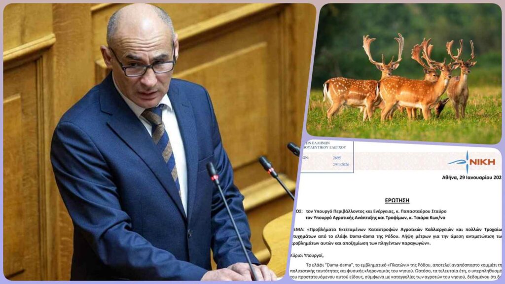 Με την Ερώτησή του ζητά επικαιροποιημένη καταγραφή του πληθυσμού των ελαφιών, τροποποίηση του κανονισμού του ΕΛΓΑ για αποζημίωση των παραγωγών, άμεση εφαρμογή των προτεινόμενων διαχειριστικών μέτρων και σύσταση Ενιαίου Φορέα Διαχείρισης για το πλατώνι της Ρόδου.