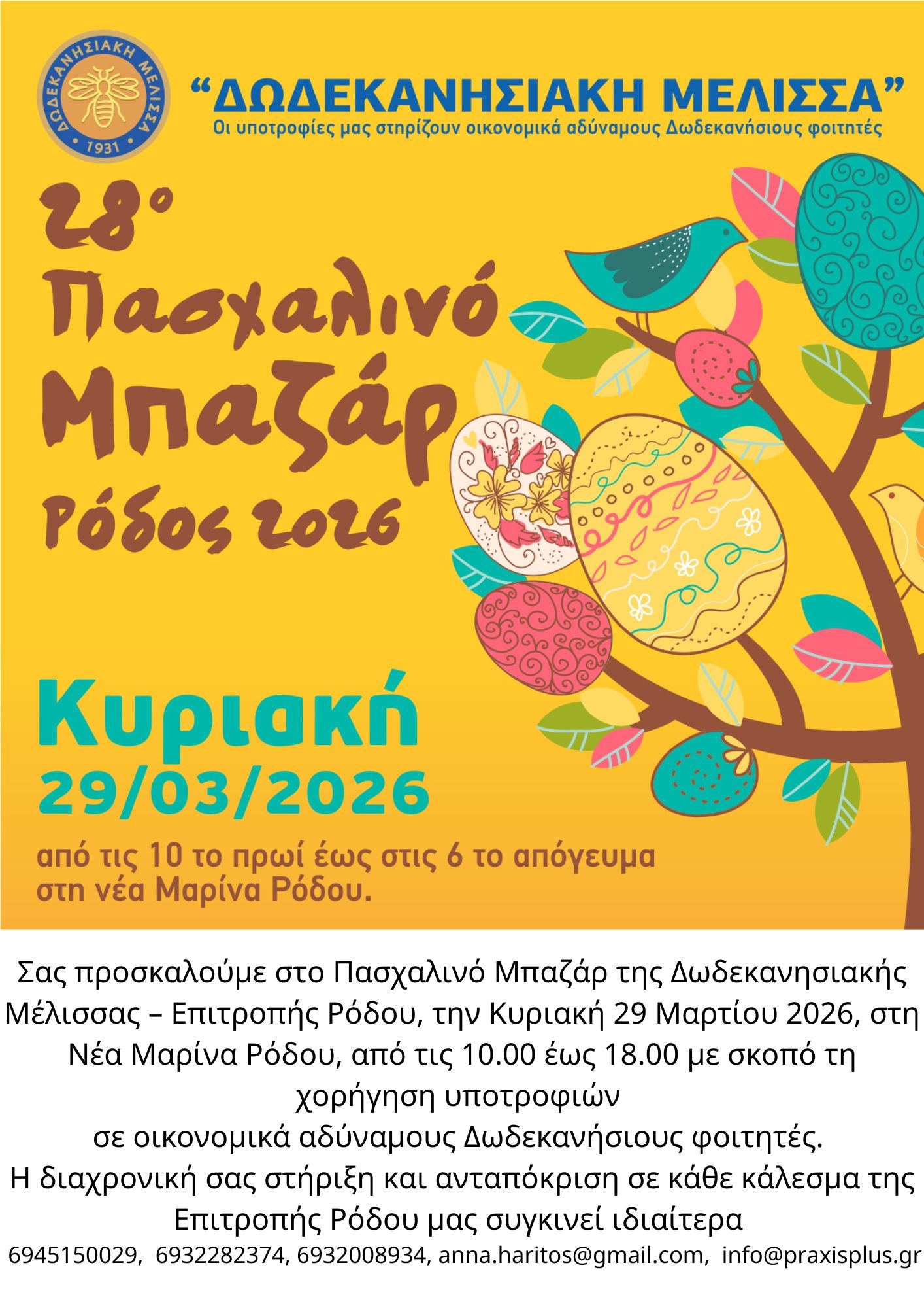 Το Μπαζάρ της Δωδεκανησιακής Μέλισσας θα πραγματοποιηθεί εσωτερικά σε προφυλαγμένο χώρο στα γραφεία της Νέας Μαρίνας Ρόδου για την ευκολία των συμπολιτών μας που στηρίζουν το έργο.
