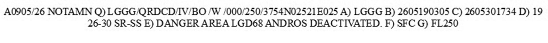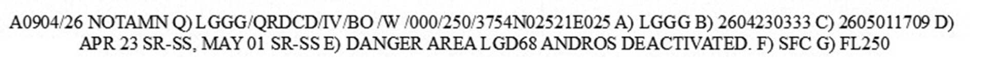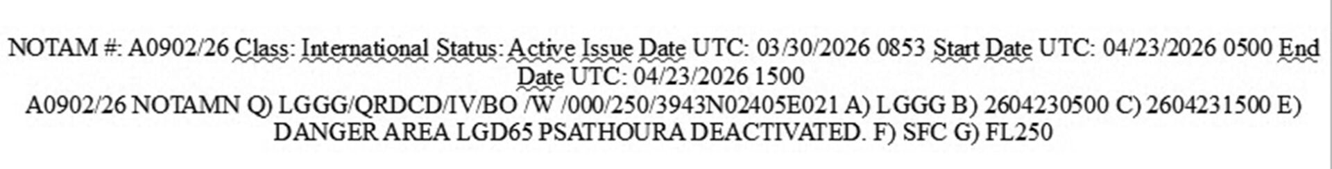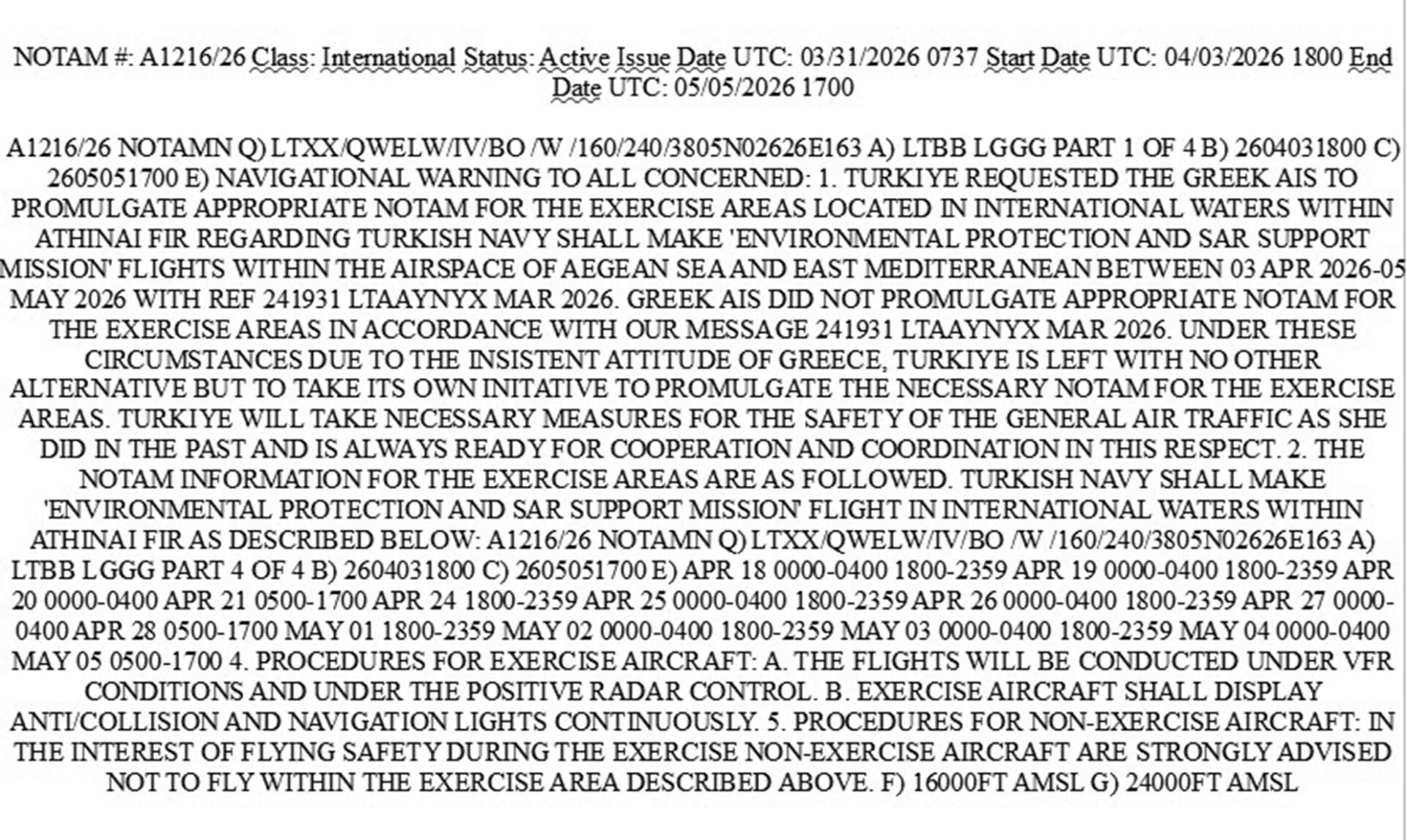 Η Τουρκία ζήτησε από την Ελλάδα να εκδώσει αγγελία για άσκηση UAV από 3 Απριλίου μέχρι την 1η Μαΐου για εκτέλεση άσκησης πέντε ώρες κάθε μέρα σε περιοχή μεταξύ Ρόδου, Καστελόριζου και άσκηση ASFAO σε περιοχή μεταξύ Σκύρου, Αη Στράτη, Λέσβου, Ψαρών και Ανδρου, δηλαδή καλύπτει ολόκληρο το Αιγαίο από τη μέση και ανατολικά, και στο κεντρικό Αιγαίο, περνά και 25 ν.μ. δυτικά της μέσης του Αιγαίου.