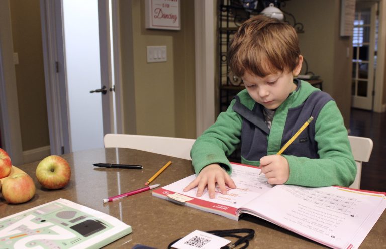 Παιδί μελετά στο τραπέζι της κουζίνας στο σπίτι του, σε μια καθημερινή σκηνή που αποτυπώνει την αυτονομία και την προσπάθεια για μάθηση, (2020). Ηνωμένες Πολιτείες, στο Λέικ Όσουέγκο του Όρεγκον.(AP Photo/Sara Cline)
